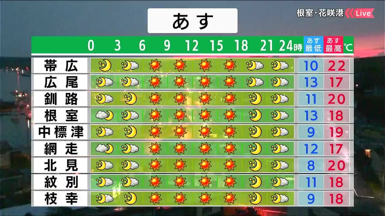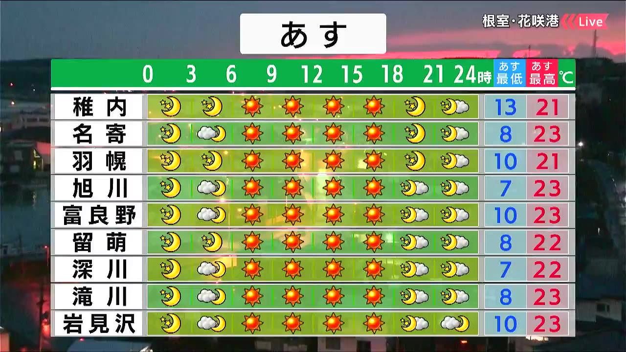 日の差す日が多いでしょう。木曜は稚内方面でにわか雨の可能性があります。気温は高めですが、オホーツク海側では日ごとの寒暖差が大きくなりそうです。
