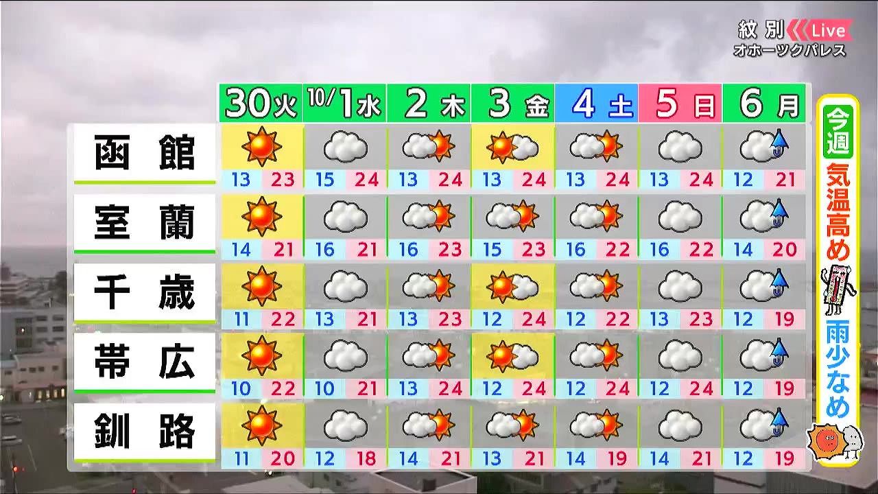 10月1日の水曜は雲に覆われ、日高地方など一部で雷雨となるおそれがあります。木曜から土曜は晴れ間が出ます。気温は今週いっぱい高めで、日中は22度前後と過ごしやすいでしょう。