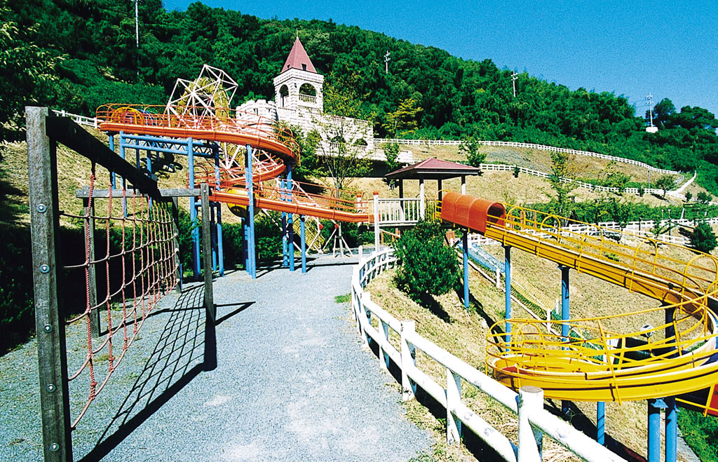 佐田岬半島特有の急傾斜地を利用した公園。園内最上部にある洋風な城を模した休憩所からの眺めは格別で、100m弱のローラーコースターやネットクライミング、アスレチックコースなどの遊具がそろい、子どもから大人まで楽しめる。
