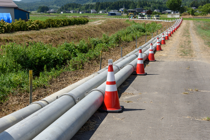 《画像:上越妙高駅付近の3か所の井戸から城山浄水場に向けて設置された配水管(2025年8月2日撮影)》