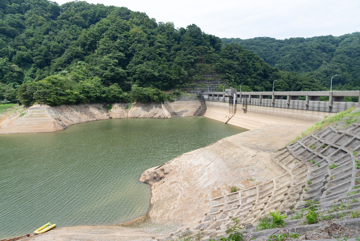 《画像:渇水時の正善寺ダム(2025年8月5日撮影)》