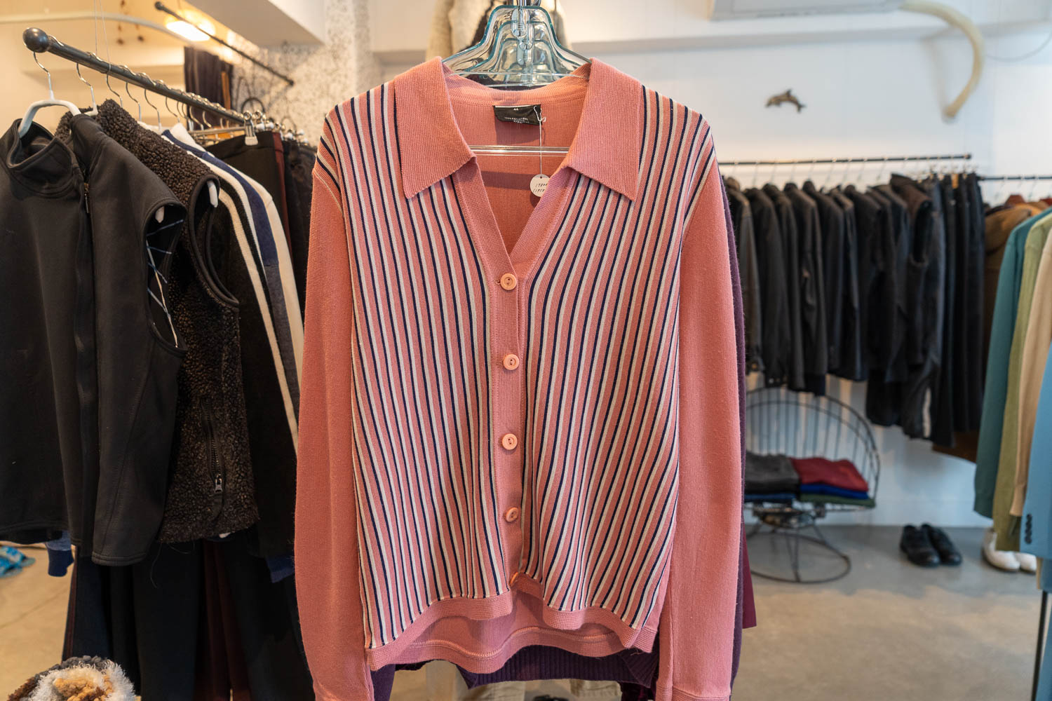 高円寺の南側で、東西方向に走る南中央通りは、駅前から延びる商店街とは異なり落ち着いた空気が流れている。『川』はその通りのビルの1階にあって、ガラス越しに余裕あるディスプレイが見える。多くの古着店に漂う「さあ、ディグって(掘り出すようにアイテムを探して)!」といった迫力は控えめで、探しやすく配置されている印象だ。