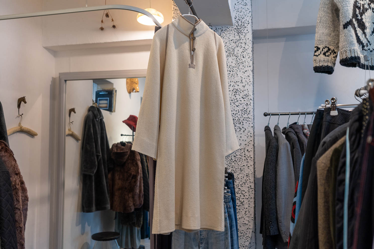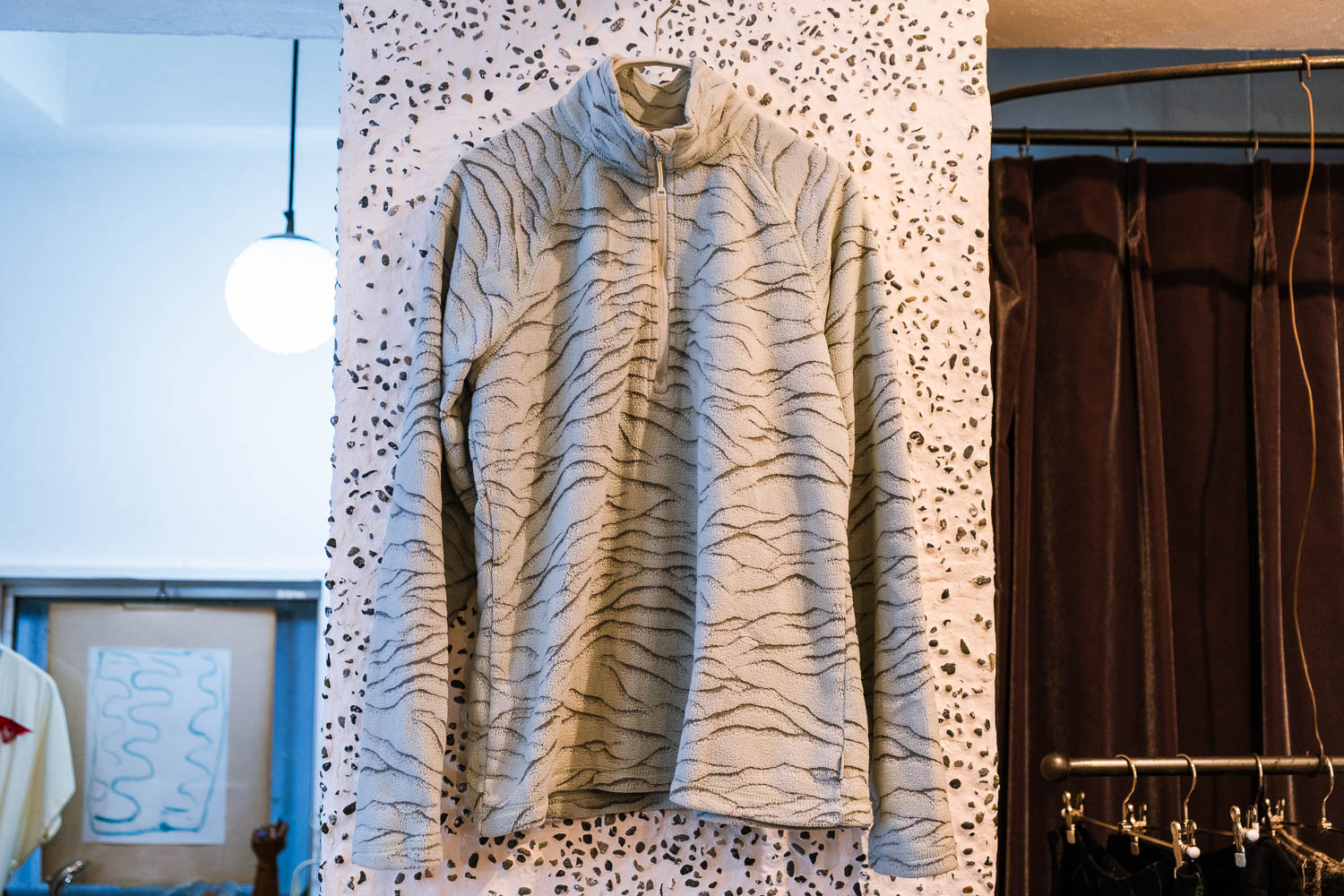 直近の買い付けで仕入れて気に入っていると教えてくれたのが、レジ横の柱にかかっていた薄いブルーグレーのフリース。山脈のようなラインが全体的に描かれている。「どこのブランドですか?」と質問したら「あ、どこだろう」と新保さんは襟元のタグを確認。デザインを重視して選んでいるため、買い付け先でもお店に戻っても、ブランドはほとんど気にしていない。自身の感覚でデザインがいいと思ったものを仕入れる方針だ。