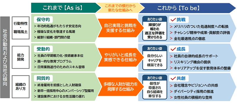 特に若手社員や現場で働く社員を念頭に置いており、社員一人ひとりが積極果敢に挑戦し、互いを尊重し合い自ら成長することで、不変の価値の追求とともに新たな価値を創造・共創することを人財戦略が目指す方向性に位置付けている。