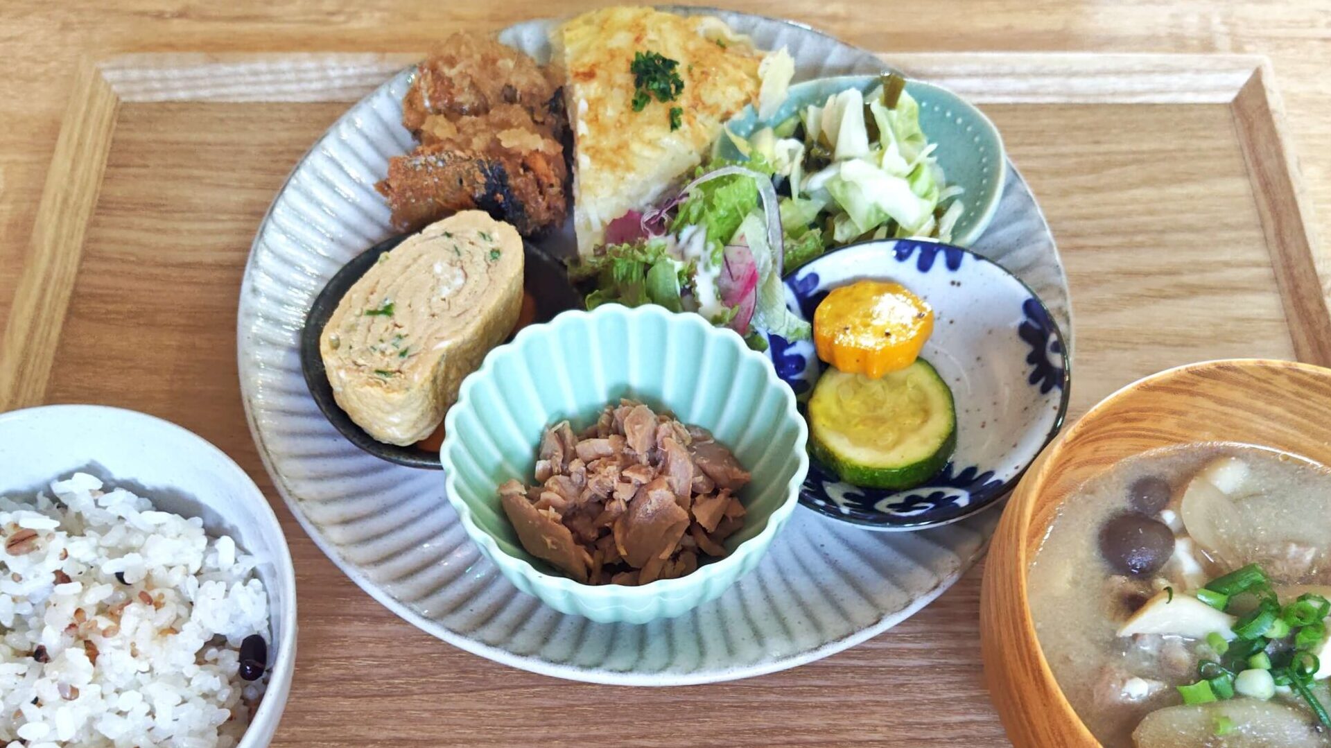 看板メニューのおばんざいランチは、五穀米と具だくさんの豚汁に加え、季節の野菜や魚を使った数種類のおかずが少しずつ並び、彩りも栄養バランスも抜群。
