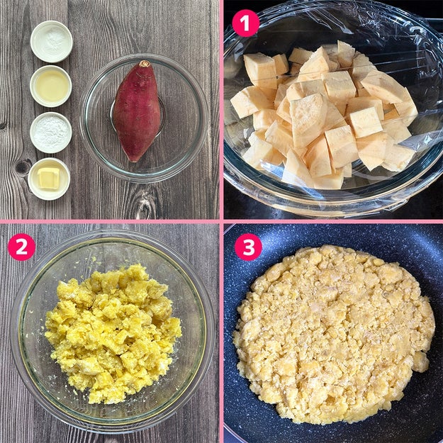 ① さつまいもは皮をむいて1.5cm角に切る。耐熱ボウルに入れてラップをかけ、600Wの電子レンジで4分ほど加熱する。