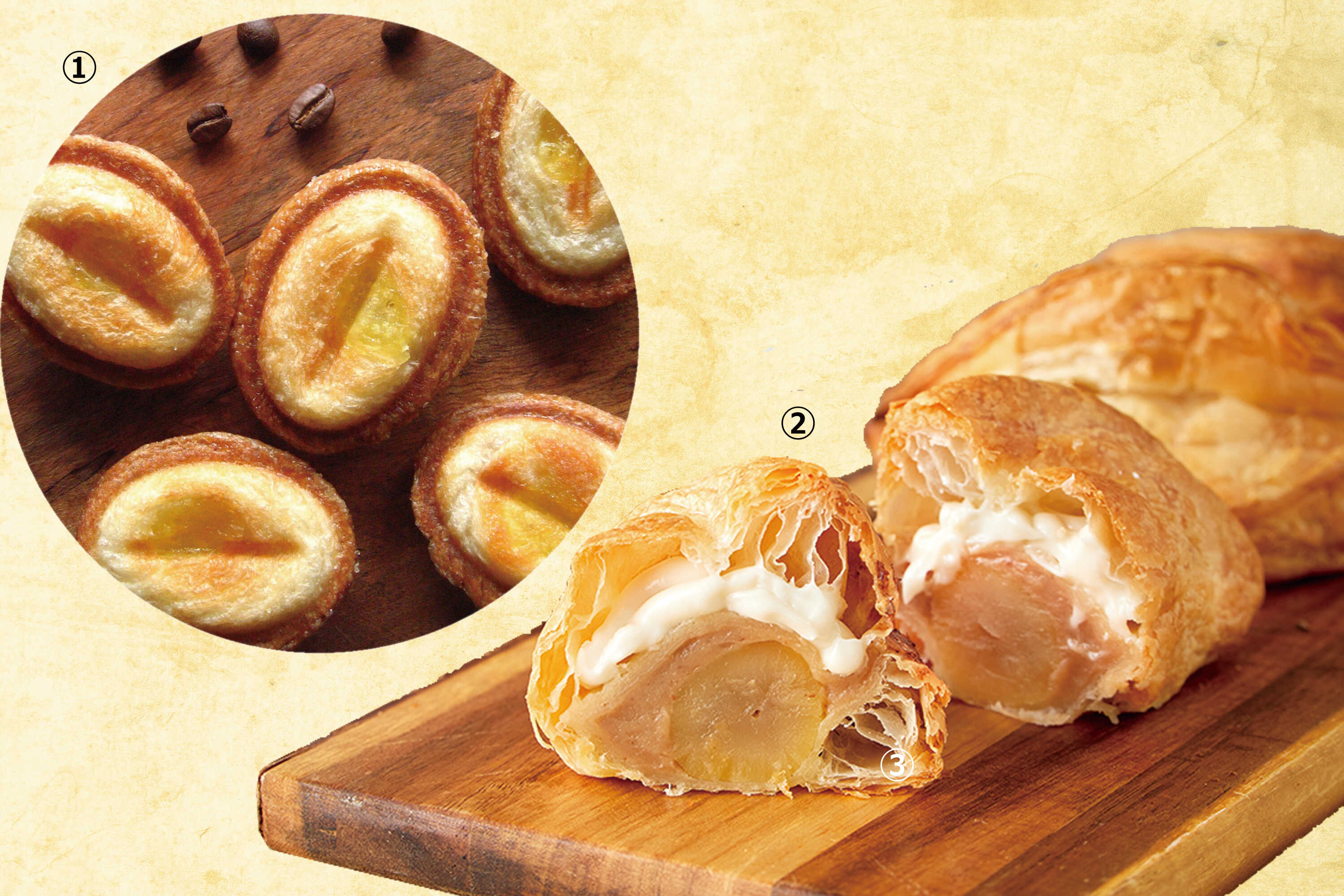 デニッシュとパイ生地の2種類の食感が楽しめる、コーヒー豆の形をしたひと口サイズのスイーツ。