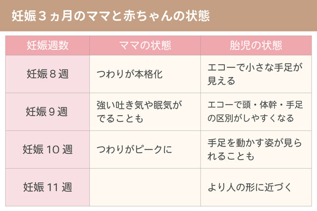 妊娠3ヵ月は、妊娠8~11週までの時期です。お母さんの体は、ホルモンの影響によりつわりがピークに達する時期に入り、生活に支障を感じる方も多いでしょう。