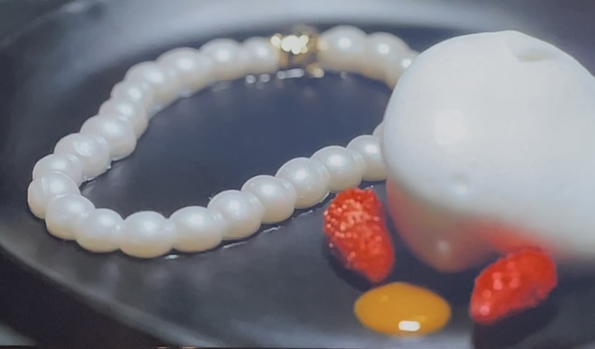 この技法を用いた品としては、ディスフルタールのシグニチャーのデザートである、真珠のネックレスのデザインを取り入れた一皿が挙げられる。パール状に輝くゼリー膜で覆われた粒は美しく、かつ、一般的な真珠より明らかに大きいのでやはりユーモラス。ぽってりした形は、バロックパールを思わせる独特の存在感もある。