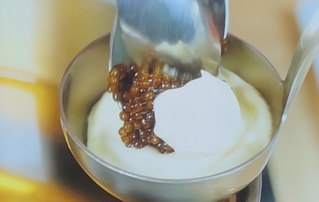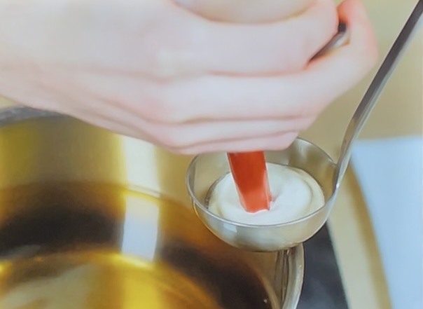 アパレイユの材料は全卵、水、小麦粉、砂糖、はちみつ、重曹。これらをなめらかに混ぜ合わせたらサイフォンに入れ、エスプーマ状に絞り出すのがポイントだ。半球のレードルにこのエスプーマ状のアパレイユを絞り出し、キャビアとサワークリームを中に入れ、さらにこんもりとアパレイユを絞る。これを揚げ油に浮かべ、何度も熱い油をかけながら球形に揚げる。