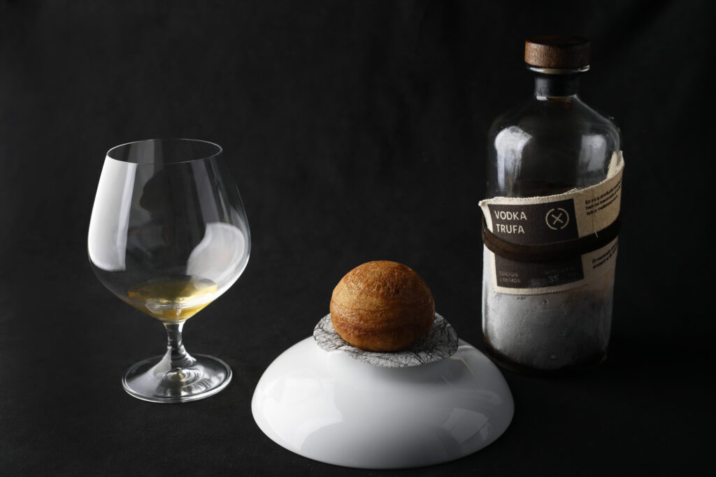 ディスフルタールを代表する一品。「人形焼に発想を得た」という、粉生地でキャビアとサワークリームを包んで球形に揚げた料理だ。トリュフの香りのウォッカとともに紹介された。