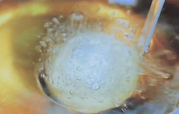 レードルを活用しながら、アパレイユのエスプーマを球形に絞り出して揚げる。途中、中央にキャビアとサワークリームを仕込む。