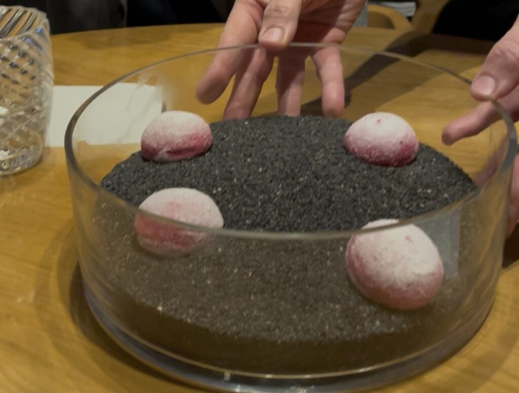 運ばれてきたものを見て「大きな器にゴマがたっぷり?」と思うが、サービススタッフがテーブル上で器を水平にぐるぐる回すと、徐々にメレンゲが頭を出す。しまいにはゴマの上に置かれた状態に。