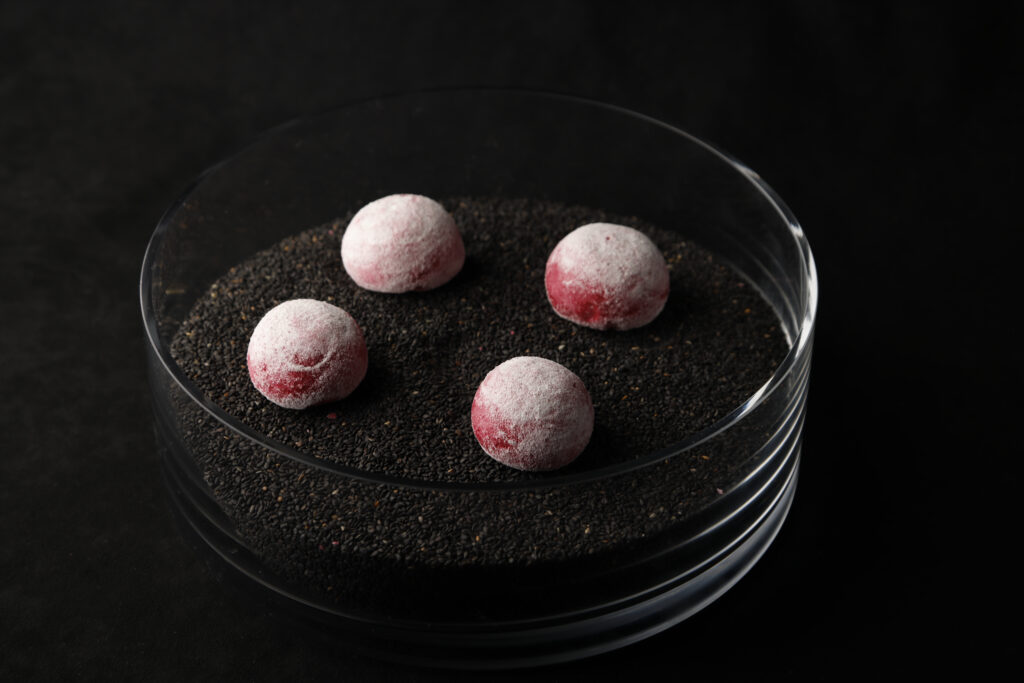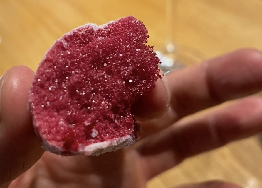 ビーツの果汁を、まるで空気のように軽いメレンゲに仕立てた菓子。その軽さの元は、気泡の細かさと、空気を抱き込む構造体であるメレンゲの圧倒的な口溶けのよさにある。噛めば口の中でサッと崩れてビーツの風味が放たれ、その風味だけ残してメレンゲは溶けて消える。