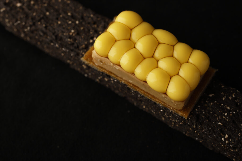 この料理は四角く整えたタルト生地とフォアグラの上に、トウモロコシのピュレをのせたもの。トウモロコシのピュレはゼリー状の膜で包んで球体とし、長方形のシリコン型の中に16〜18粒ほど入れて結着させた。実際のトウモロコシに似ていながらも粒が大きく、かつ不規則な並びが軽い違和感を生む形状がおもしろい。美しさとユーモアが同居し、かつ、だまし絵を見るような不思議さも感じられる独特の存在感は、まさに記憶に刻まれるビジュアルだ。