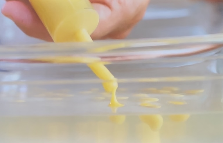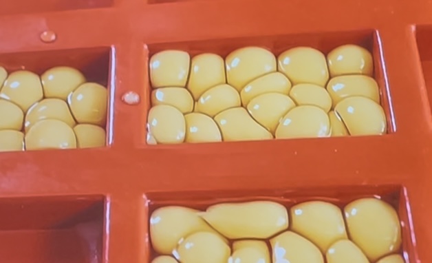 トウモロコシのピュレをスフェリフィケーションの技術を用いてゼリー膜で包み、シリコン型へ。10分ほどで結着する。
