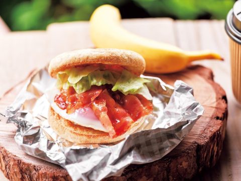 31のマフィンの下半分に2の目玉焼き、ベーコンをのせる。レタスを重ねて上半分のマフィンをのせてはさみ、アルミ箔やラップで包む。好みでバナナを一緒に。