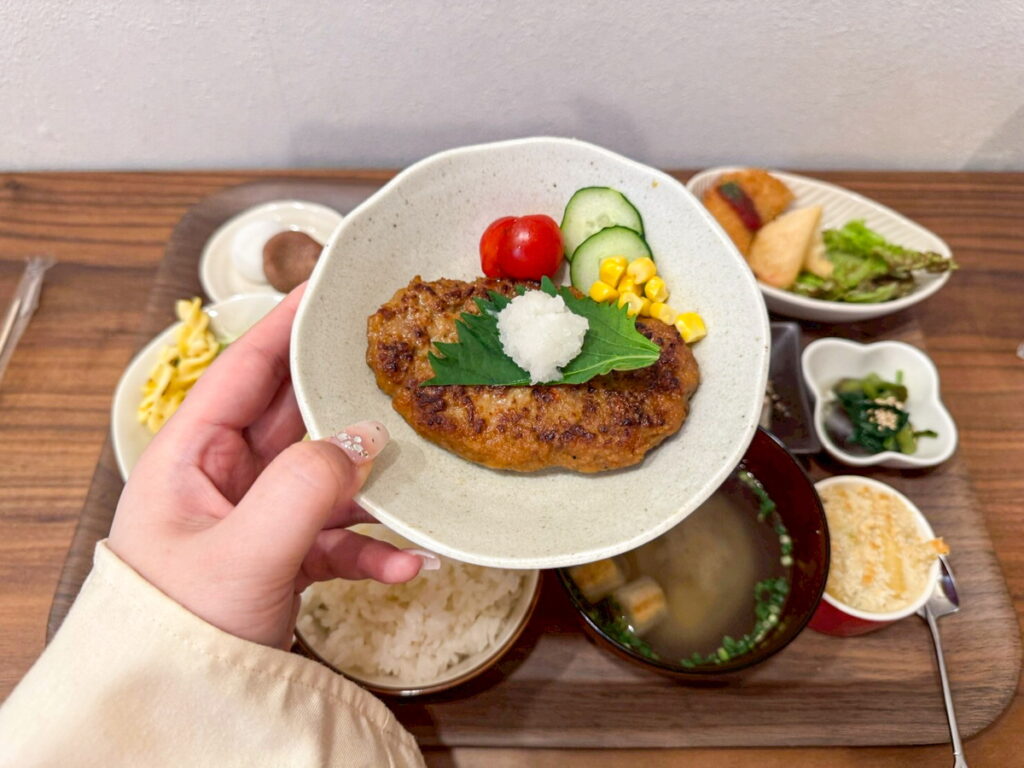 ハンバーグはふっくらジューシーで、大葉と大根おろしの香りが広がる優しい味。
