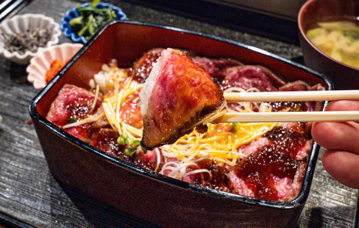 今回いただいたのは、注文を受けてから丁寧に火入れされるステーキが、炊きたてのご飯の上に美しく敷き詰められた至福の「ステーキ重」。
