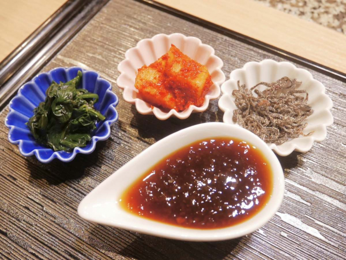 セットには手作りのナムルとキムチ、お味噌汁が付いています。