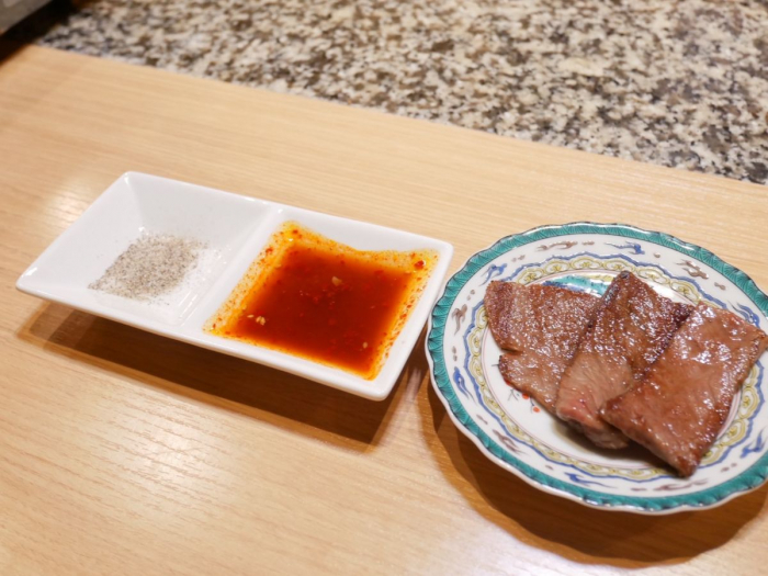 焼き上がったお肉は、慶オリジナルのブレンド塩や醤油ベースの自家製タレでいただきます。