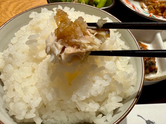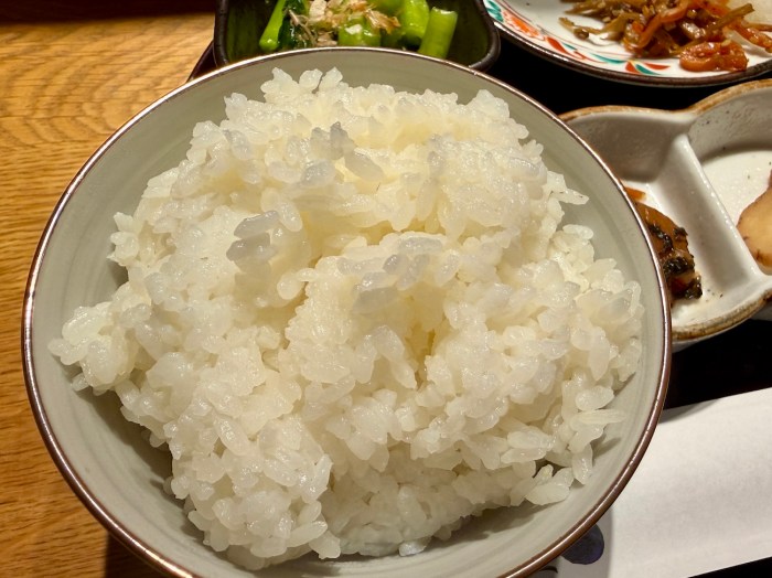 そしてやはり、ツヤツヤの白米である。粒立ちがしっかりしていて噛むほどに甘みが広がる……ひと口ひと口が “ちょっといい温泉旅館の朝” そのもの。あみ城は都心かつ駅近でありながら旅館気分を味わえる数少ない場所だと実感した。