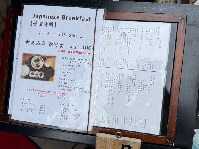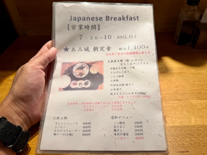 東京メトロ・都営地下鉄大江戸線の「麻布十番駅」から徒歩わずが1分。大通りから少し入った住宅街の一角に「あみ城」はある。公式サイトによると、朝食は7時30分から10時30分までとのことだ。
