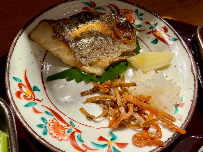 10分ほど待って運ばれてきたのは、まさに “旅館の朝ごはん” と呼ぶにふさわしい豪華な定食だった。焼き魚が主役で、きんぴらごぼう、こんぶ佃煮、紀州南高梅の梅干しなどががっちりと脇を固めている。