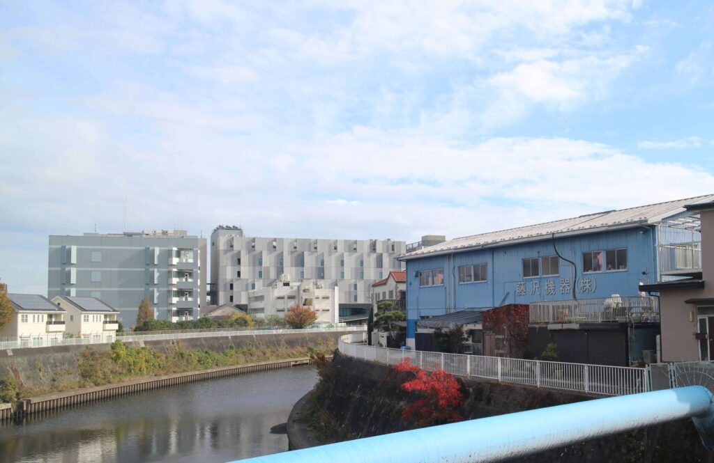 藤沢駅から歩くこと13分、柏尾川に架かる橋を渡った先に見えるのがKIKI BASE FUJISAWA。