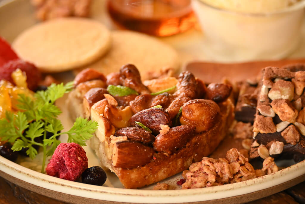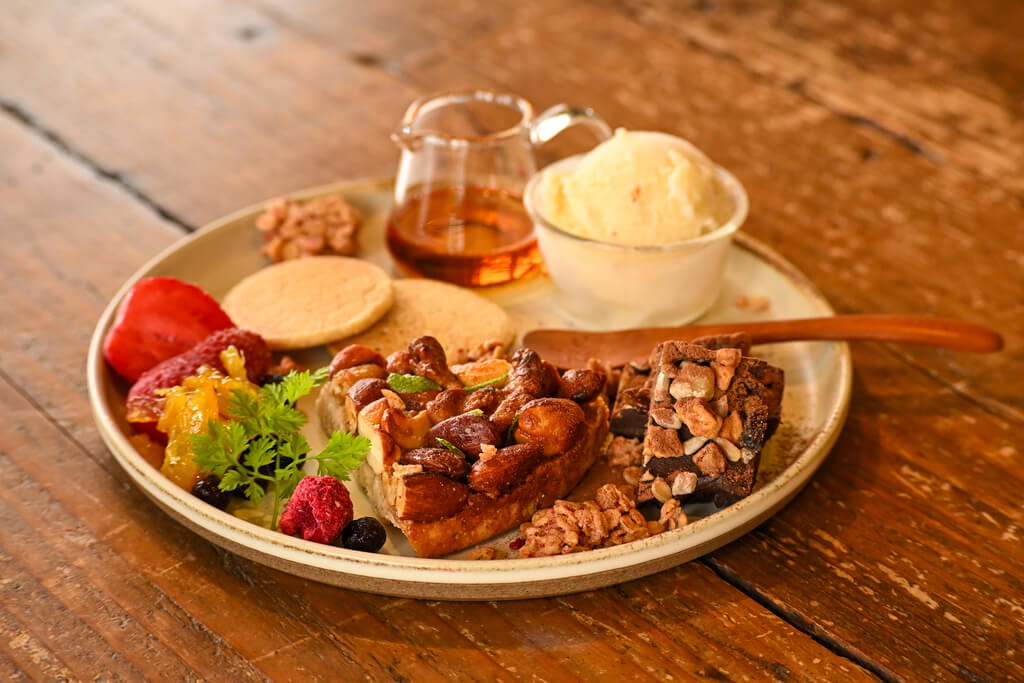 「スイーツプレート」には、豆乳仕立てのジェラート、フロランタン、全粒粉のパンケーキなどが並びます。ナッツの香ばしさやフルーツの酸味がアクセントになっておりオーガニックに馴染みのない人でも食べやすいセットです。