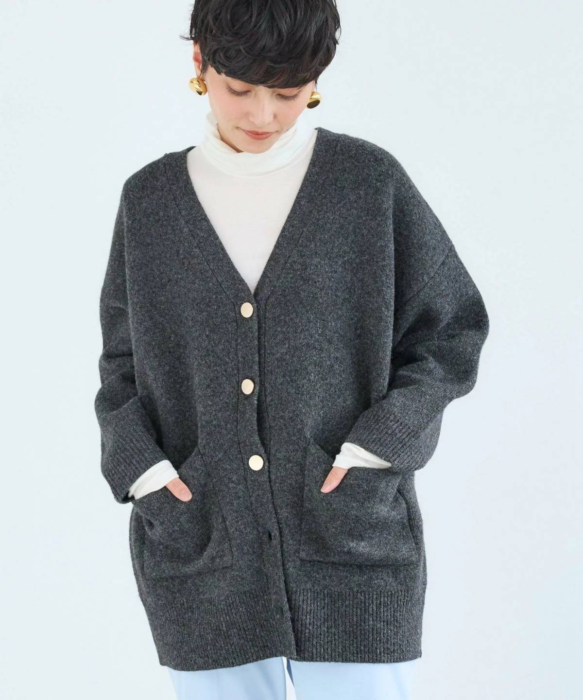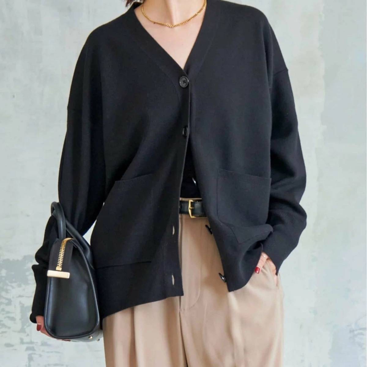 深めVネックデザインのカーディガンは、顔まわりがすっきり見えるところが◎