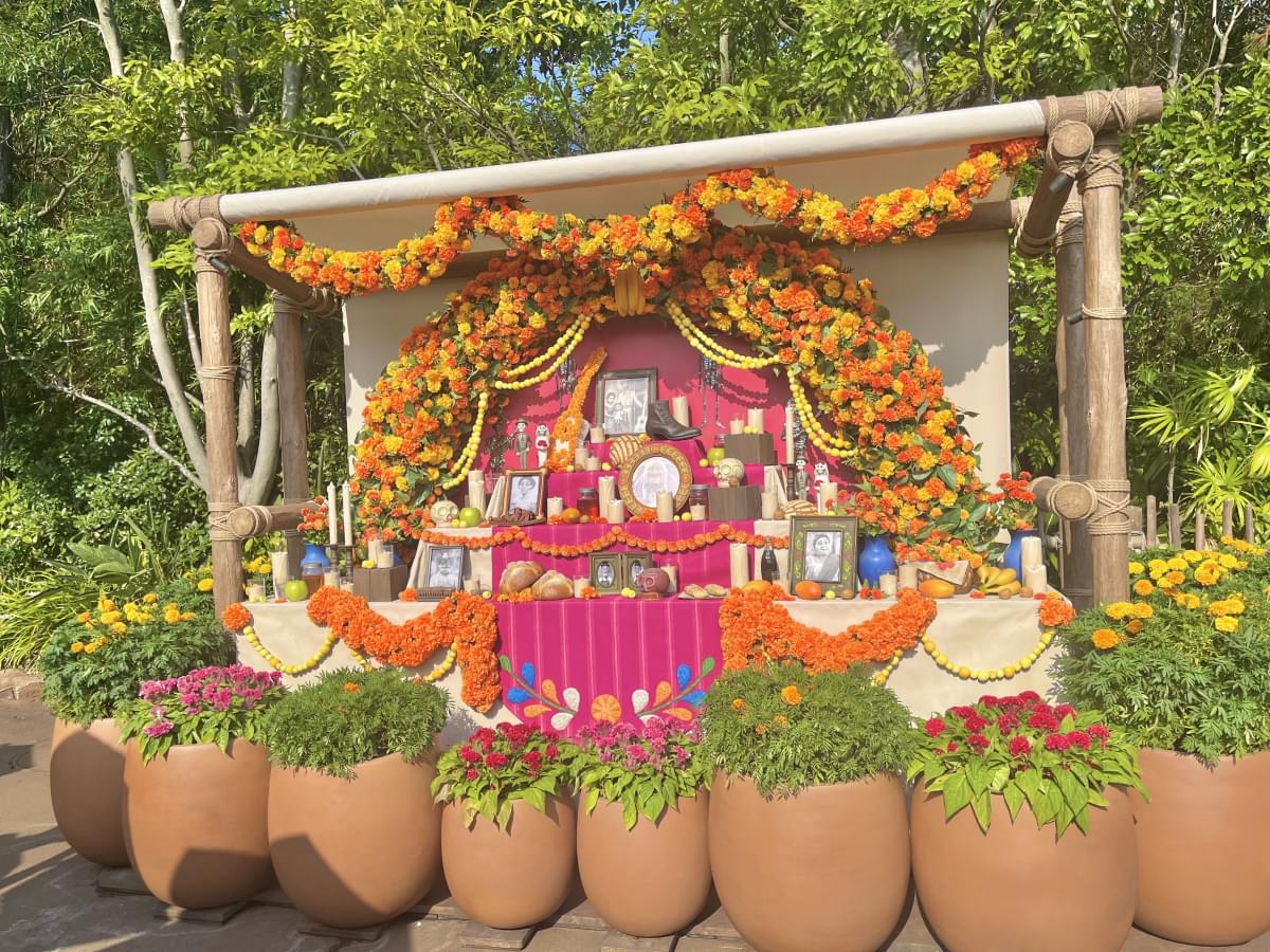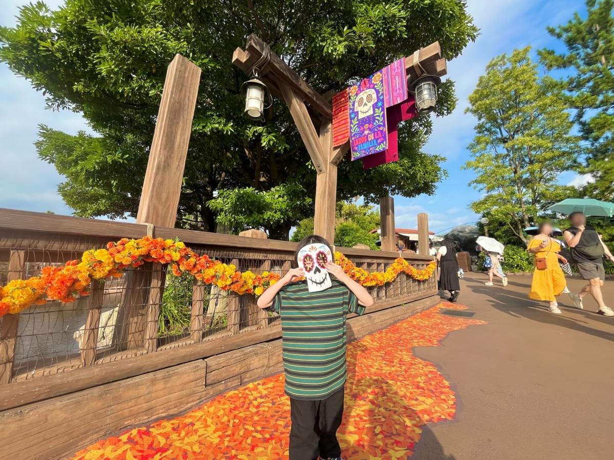 「ロストリバーデルタ」にかかる橋「プエンテ・ブエナ・ヴィスタ」には、鮮やかなマリーゴールドが飾られフォトスポットとしても最適。ガイコツお面を身に着けて『リメンバー・ミー』の登場人物の気分で記念撮影をするのもおすすめですよ。