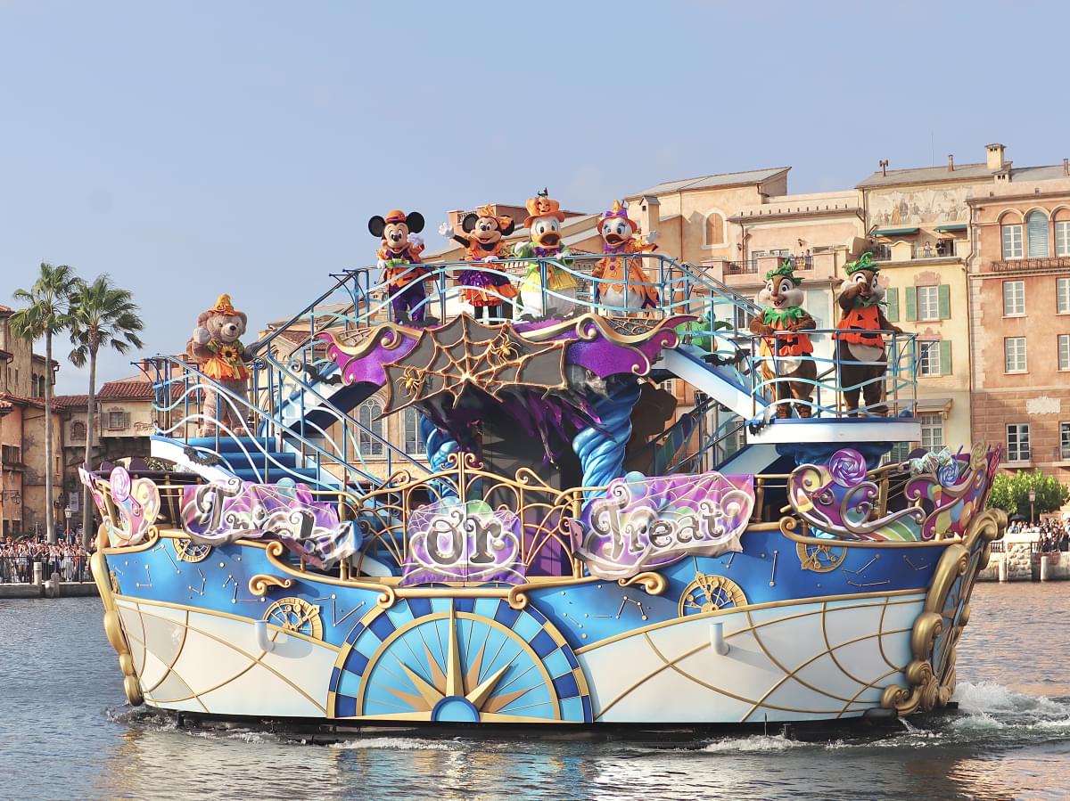 「メディテレーニアンハーバー」では、大きなパンプキンやたくさんのお菓子を載せた船に、ミッキーと仲間たちがのって登場するハーバーショー「ディズニー・ハロウィーン・グリーティング」が開催。約15分間のショーなので、待ち時間が長くなりすぎず、小さな子どもでも集中して見やすいのが魅力です。