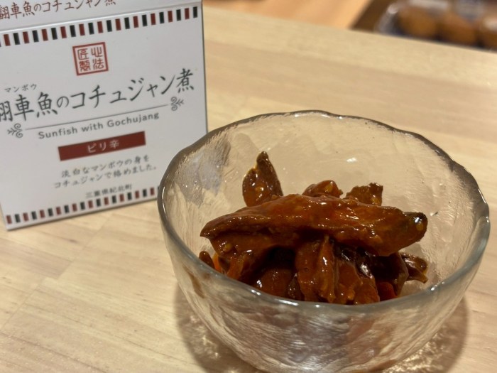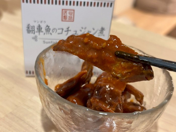 ちなみに、マンボウだけでインパクト大だが、タレもこだわりらしい……。地元の糀屋さんが特別に調合した秘伝のコチュジャン。マンボウの身はあの塩顔同様たんぱくとのことで、タレが決め手になるのだろう。