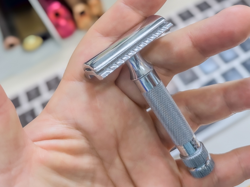 T字カミソリの原則は首元をつまむように掴むこと。ハンドル部分はぶらぶらしても良いくらい。軽く指を添える程度です。ハンドルが長いと指ががっちり引っかかって、てこの原理で刃が肌に食い込みやすいのですが、『プロジスタ 6枚刃シェーバーホルダー』はハンドルが短いので引っかかりにくいのが特徴。その分、取り回しの自由度があって、ヒゲ剃りがうまくなったように感じます。