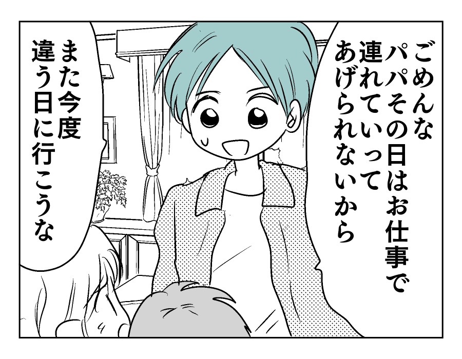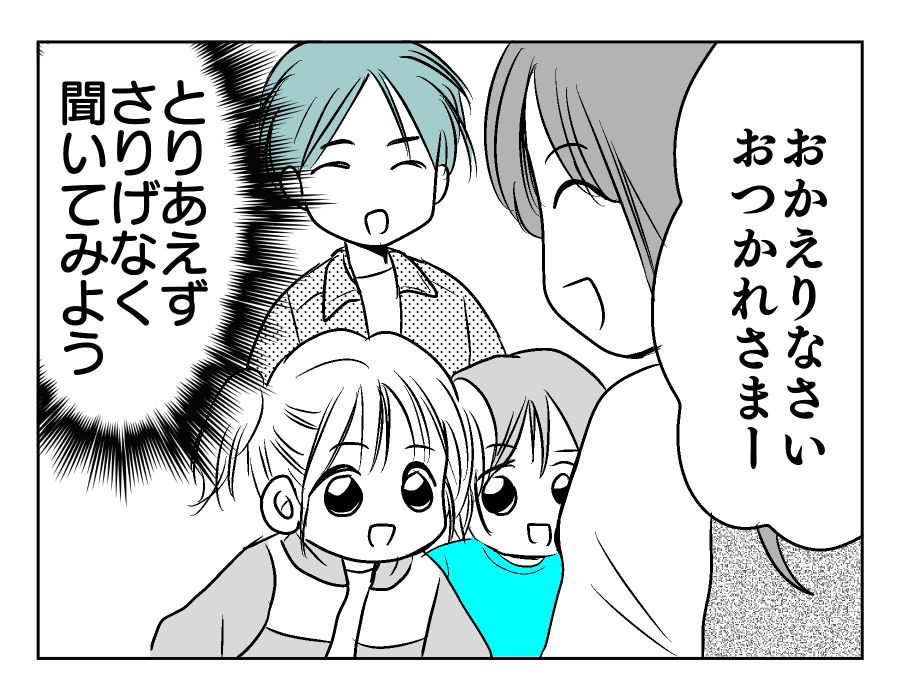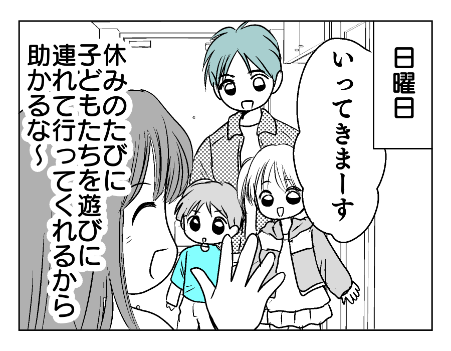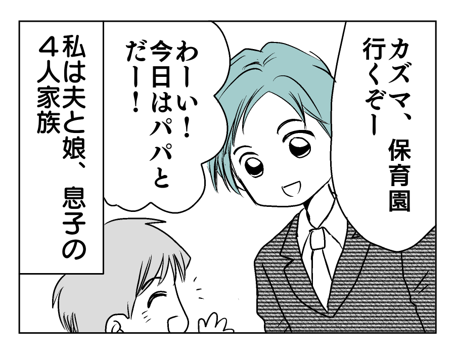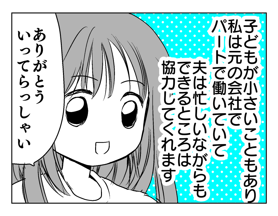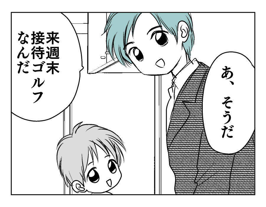 【編集部コメント】 ユズキさんは、夫のマモルさんとお互いにできることを考えて協力しあってきたようです。子どもがすごくパパに懐いている様子からも、マモルさんがいかに普段から子どもたちと触れ合っているかが分かりますね。マモルさんは休日に接待ゴルフに駆り出されるなど、なかなか多忙のようです。その大変さをねぎらいながら、今朝もユズキさんはマモルさんのことを送り出しました。どう見ても平和な家庭のように思えます。