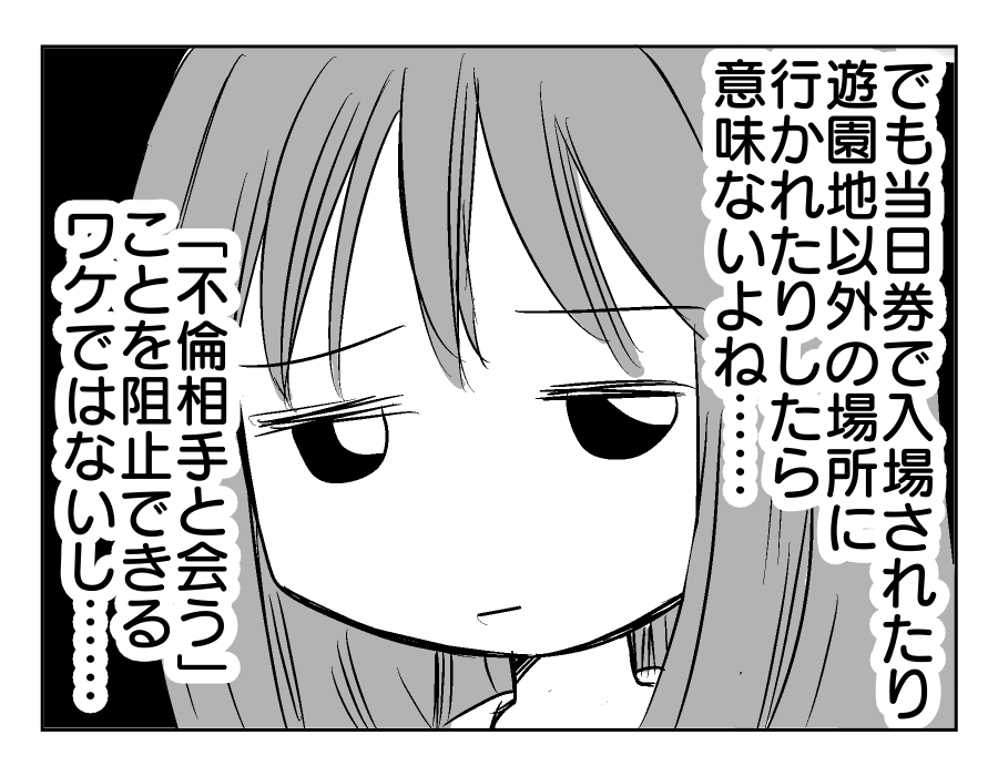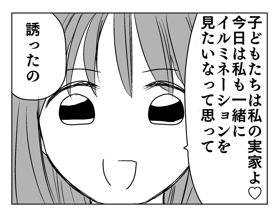 【編集部コメント】 「遊園地」や「イルミネーション」なんていう楽しそうな言葉を聞きつけて、子どもたちも興味津々。けれどそんな子どもたちの頭を撫でながら「その日はお仕事」と断ったマモルさん。これでイルミネーション点灯式は、家族に嘘をついて他の「誰か」と行くつもりであることがはっきりしましたね……。ユズキさんは今すぐその手を払いのけたい気持ちでしょう。