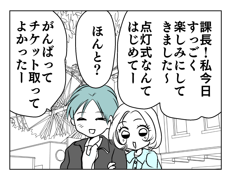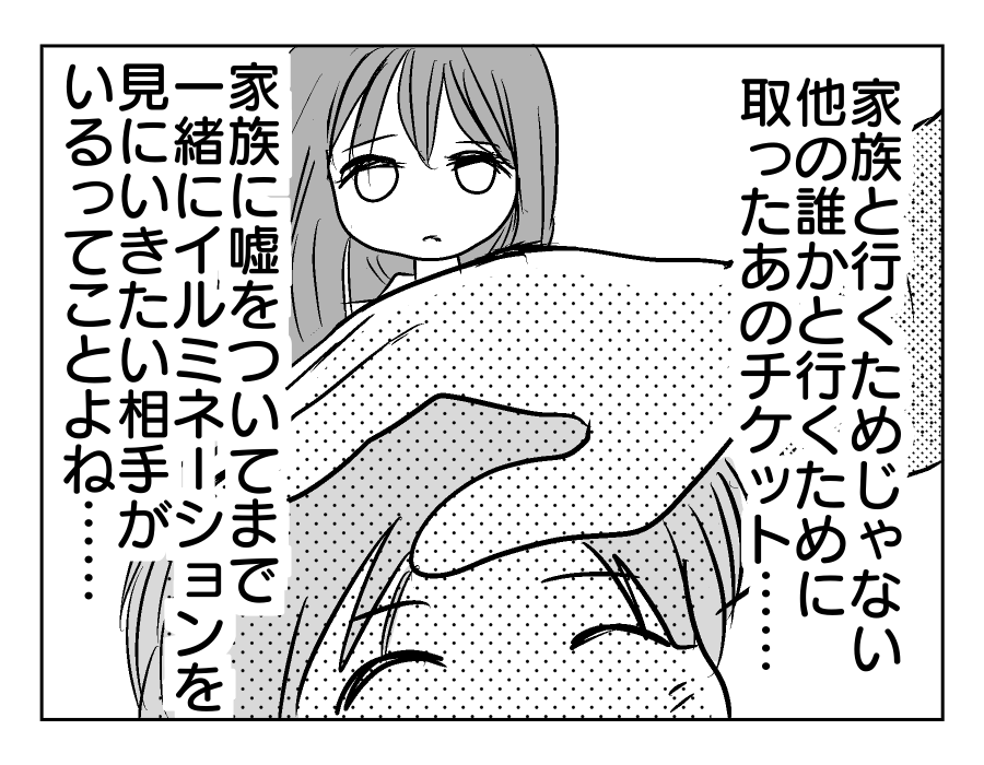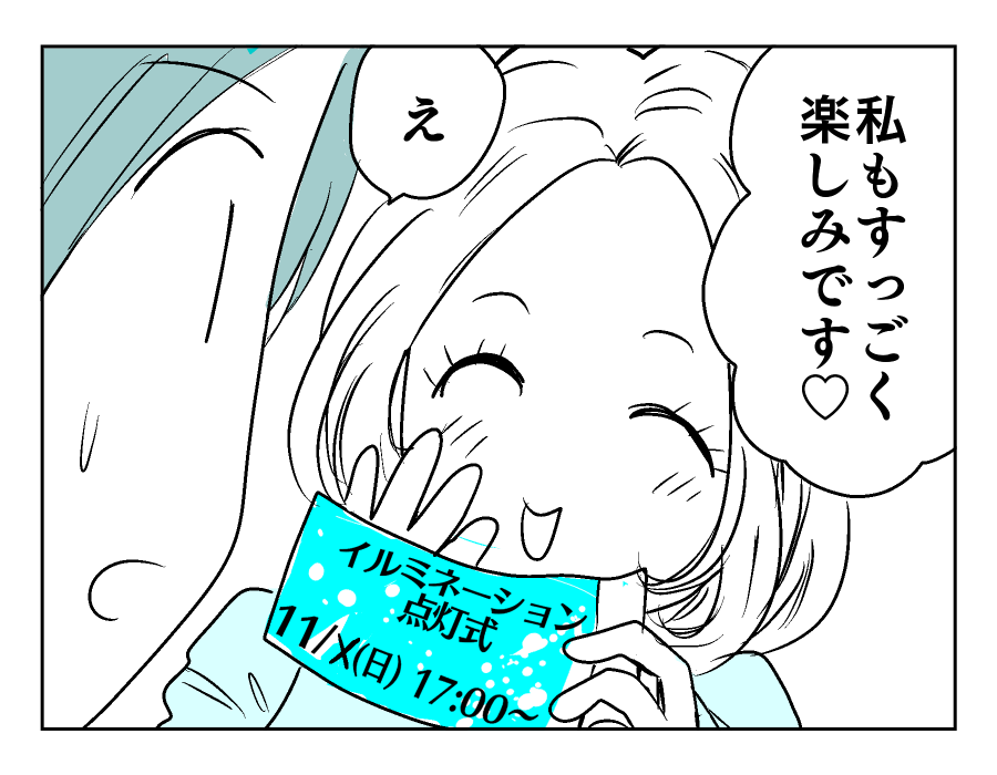 【編集部コメント】 不倫相手を急に名字で呼び始めたマモルさん。早く帰ろうと、不倫相手である「ミチルさん」を急かします。おやおや、いったいどうしたんですか? もうすぐ点灯式が始まりますよ? そこまで焦るってことは、チケットに込められたメッセージの意味に気付いたってことですよね。ユズキさんも、「一緒に」楽しむためにわざわざスペシャルゲストを誘ったようですよ。