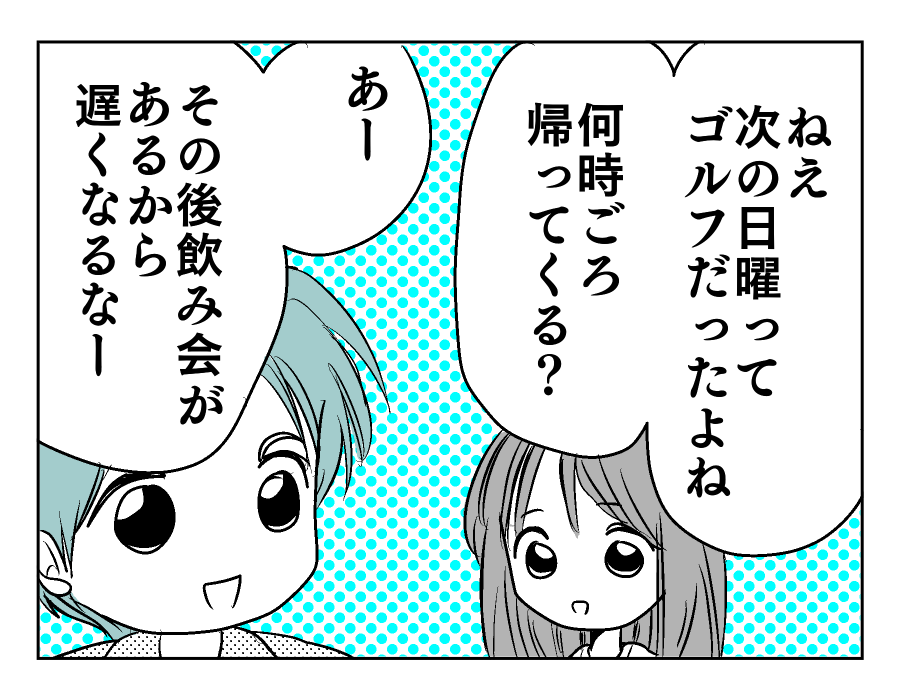 【誰と行くの?夫の裏切り】仕事で多忙な夫「来週末は接待ゴルフ」ねぎらう私#4コマ母道場