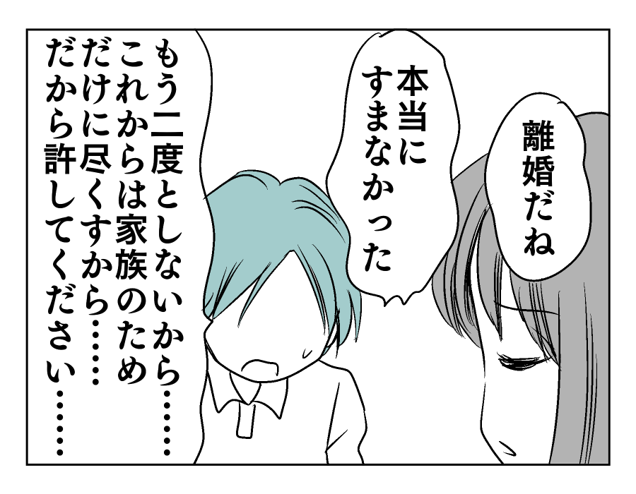 【編集部コメント】 ユズキさんは許しを請うマモルさんをバッサリと切り捨てました。許すかどうかはユズキさんが決めることであって、マモルさんがお願いすることではありません。せめて「許さなくてもいいから隣にいさせてください」くらいの気持ちでいてほしいところですね。それくらいの誠意を尽くしていけば、長い夫婦生活のなかでいつか「あんなこともあったね」と笑い合える日がくるのかもしれません。