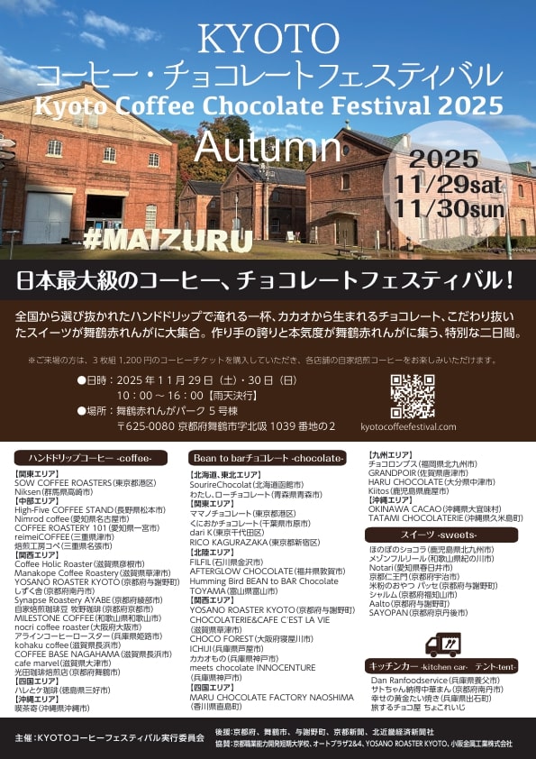 2025年11月29日(土)・30日(日)の2日間、京都・舞鶴赤れんがパークで「KYOTOコーヒー・チョコレートフェスティバル」が開催されます。ハンドドリップコーヒーやこだわりのチョコレートを楽しめる祭典です。
