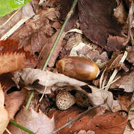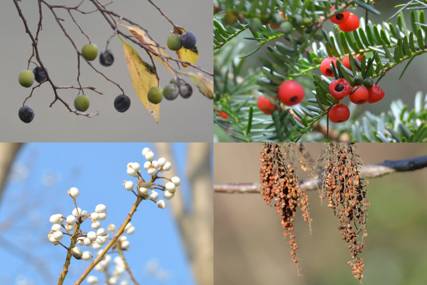 アトリが食べる木の実の一例。上段右から時計回りに、イチイ、ヌルデ、ナンキンハゼ、ムクノキ