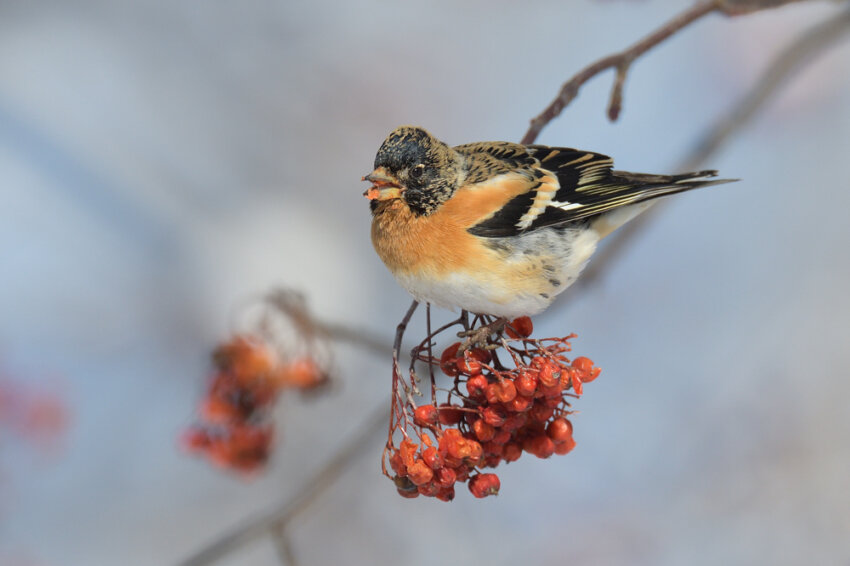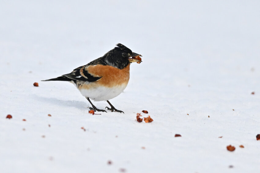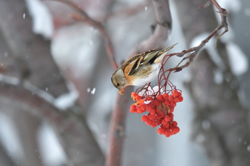 純白の雪をかぶったナナカマドの赤い実。そこに、オレンジ色と黒の配色のアトリが群れ、さらに雪がチラチラ舞っていたりすれば、北国らしい真冬の情景の出来上がりです。
