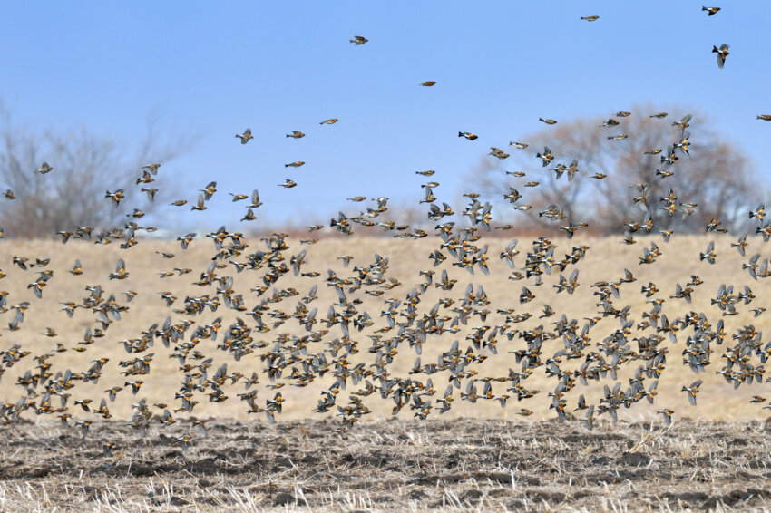 農耕地を飛び回る群れ。1000羽近い群れの一部を切り取った写真
