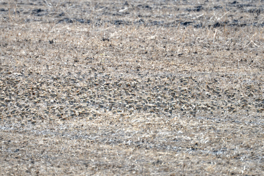 1000羽程度でも、農耕地の地上で採食していた群れが飛び立つ瞬間には、まるで一瞬地面が動いたかのように感じられるものです。