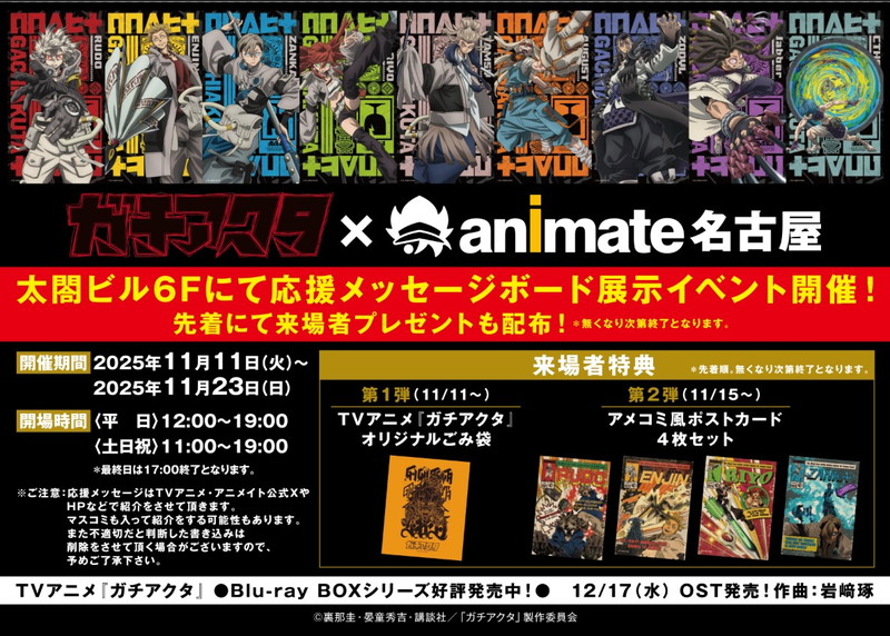 アニメイト名古屋でTVアニメ『ガチアクタ』展示が開催される。会場では、9月に開催されたアニメイト池袋本店同様のメッセージボードがさらに拡大され、大型キャラクタービジュアル展示やガチアクタの世界観をイメージしたグラフィティ満載の背景(ウォールアート)で記念撮影もできるスポット、池袋でも好評だったチビルドコーナー、声優サイン入りの等身大スタンディ展示が予定されている。さらに先着順で入場者特典が貰えるので遊びに行くだけでもお得な展示イベントとなっている。