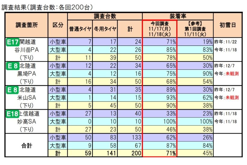 この調査は冬用タイヤの早期交換を喚起し、冬道の安全運転を啓発することを目的として実施されているもので、NEXCO東日本は「まだ冬用タイヤを装着していない場合は、早めの冬用タイヤへの交換とチェーン携行を」と呼びかけている。