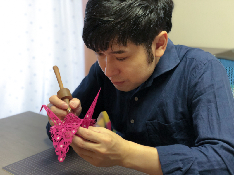 切り絵を始めた当初は平面作品を手掛けていましたが、「どうやったら自分だけの表現ができるかな」と模索していた時期があったそうです。もともと工作や折り紙が好きだったことがヒントとなり、ある時ふと「折り紙に切り絵を施したらどうなるだろう」と思い立ち、試作を重ねて現在の立体切り絵というスタイルが生まれたといいます。