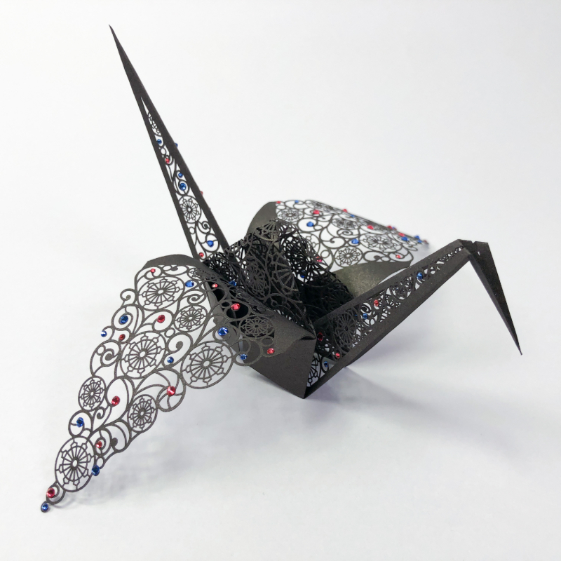 チラシにも掲載されている代表的な黒い折り鶴などは、その緻密さに驚かされます。線の細さはなんと0.5ミリほど。鶴の片羽を仕上げるのに10時間以上、作品全体では2週間ほどかかることもあるそうで、「細かいほど時間がかかりまして」と、繊細な手仕事の裏側を教えてくださいました。