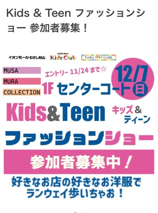 「キッズ&ティーン ファッションショー」が12月7日(日)にイオンモールむさし村山で開催されます。